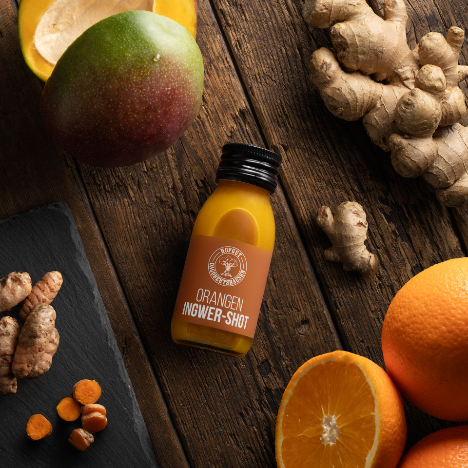 Der Anbau von Ingwer in Dagobertshausen verbindet innovativen Pioniergeist, landwirtschaftliches Geschick und einen nachhaltigen Ansatz gleichermaßen. In unserem Orange-Ingwer-Shot machen wir die volle Wirksamkeit und Kraft des regionalen Ingwers ganzjährig verfügbar – gesunder Genuss, und das mit gutem Gewissen.