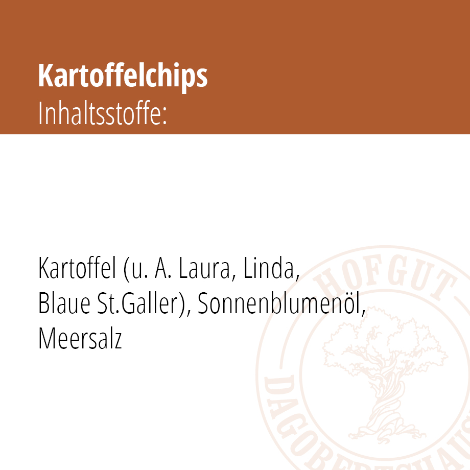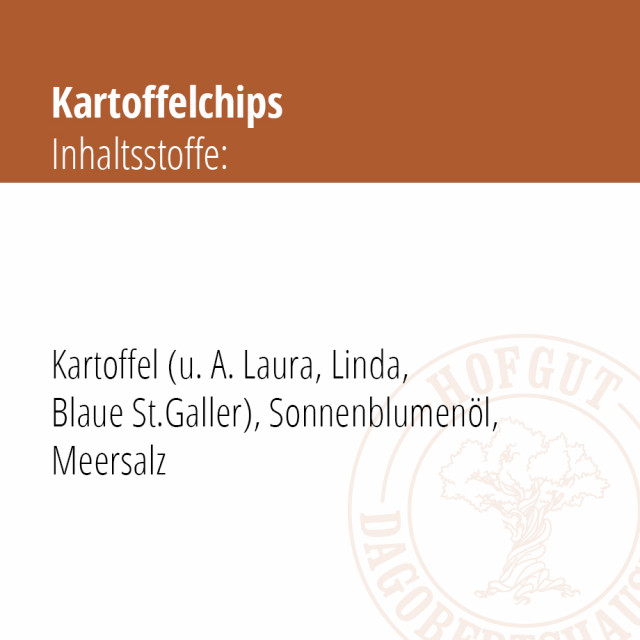 Durch das neue Verfahren des „Vakuum-Frittierens“ werden unsere Chips ca. 50 °C niedriger gebacken als üblich. Dadurch reduzieren sich die Acrylamidwerte und gleichzeitig wird der Fettanteil um 30 % reduziert. Dieses besondere Verfahren ermöglicht es uns, dass wir unsere hochwertigen Dagobertshäuser Speisekartoffeln Linda und Laura verwenden können und keine hochgezüchteten „Chips-Kartoffeln“ nutzen. Ebenso verzichten wir komplett auf Geschmacksverstärker und künstliche Zusatzstoffe. Wir würzen ausschließlich mit reinem Meersalz.