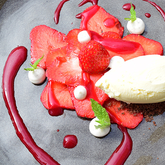 Vanille-Joghurt: Vanillemark, Zucker und Rum vermengen und mit dem Joghurt verrühren. Schoko-Streusel: Mehl, Butter und Zucker vermischen und bei 170° C ca. 25 Minuten aufbacken. Aus dem Ofen holen und direkt mit dem Kakao vermengen. Abkühlen lassen und mit einem Mixer so lang aufschlagen, bis der Teig schön zerbröselt ist. Erdbeer-Mousse: In den Entsafter geben und mit einer Löffelspitze Agar abbinden. Ca. 3-4 Erdbeeren pro Portion in Scheiben schneiden und in Rosenform auf 4 flachen Tellern anrichten. Einige Tupfen vom Vanille-Joghurt auf den Erdbeeren verteilen. Ein kleines Bett aus Schoko-Bröseln und Erdbeer-Mousse seitlich auf den Erdbeeren anrichten. Darauf eine schöne Nocke Vanilleeis geben. Mit Minzblättern verzieren.
