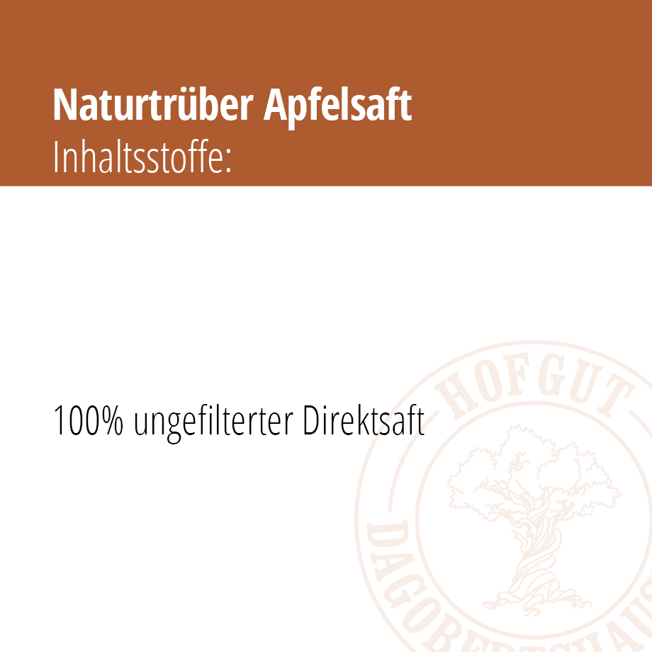 Von unseren Dagobertshäuser Mischobstwiesen stammen die vollreifen Äpfel unseres eigenen Apfelsaftes. Es ist ein wertvoller Direktsaft, der nicht gefiltert wird und daher die gewünschte Naturtrübe hat. Ohne Zusätze, 100% Fruchtgehalt, 100% Heimat.