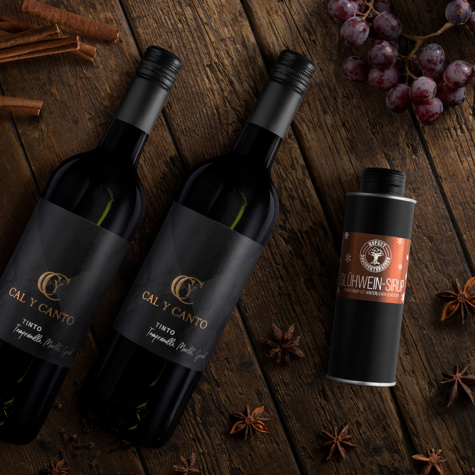 Für guten Glühwein benötigt man eine ausgewogene Gewürzmischung sowie einen intensiven und hochwertigen Rotwein. Beides haben wir uns zur Aufgabe gemacht - und sind fündig geworden. Die Gewürzkomposition unseres original „Hofgut Dagobertshausen Glühwein“-Sirups ist perfekt auf den intensiven Geschmack des „Cal Y Canto“-Rotwein Cuvées abgestimmt. Ein ideales Cuvee aus Tempranillo, Merlot und Syrah-Trauben, das selbst ohne den Glühwein Sirup solo ein echter Genuss ist.Die 2 x 0,75 Liter Flaschen „Cal Y Canto“ und eine Dose Glühweinsirup (250 ml) sind mengenmäßig optimal aufeinander abgestimmt. Einfach beides zusammen erhitzen (NICHT kochen!) und direkt genießen.