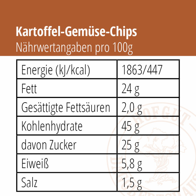 Das neuartige „Vakuum-Frittier-Verfahren“ ermöglicht uns die Herstellung von Gemüse-Kartoffel-Chips, die durch einen einzigartigen Geschmack und Konsistenz bestechen. Wie schon bei unseren Kartoffel-Chips ergibt sich, mithilfe der um 50 Grad reduzierten Temperatur, ein 30% geringerer Fettanteil und ein deutlich reduzierter Acrylamidwert. Mittels diesen Verfahrens können wir ein Produkt anbieten, welches den Namen „Gemüse-Chips“ zu Recht trägt. Wir verzichten dabei auf Geschmacksverstärker sowie künstliche Zusatzstoffe und würzen ausschließlich mit Meersalz.